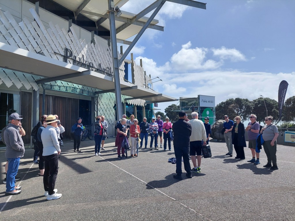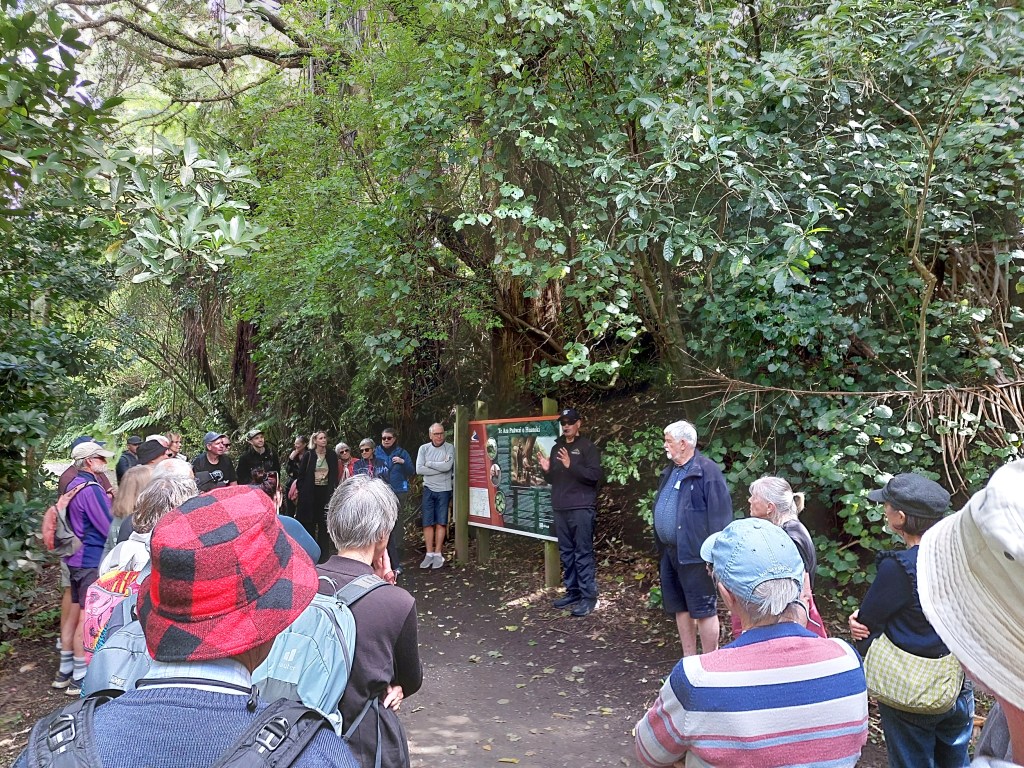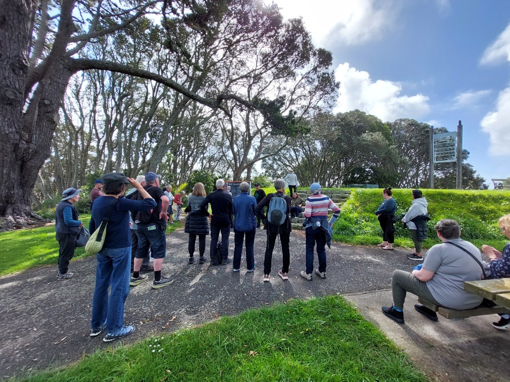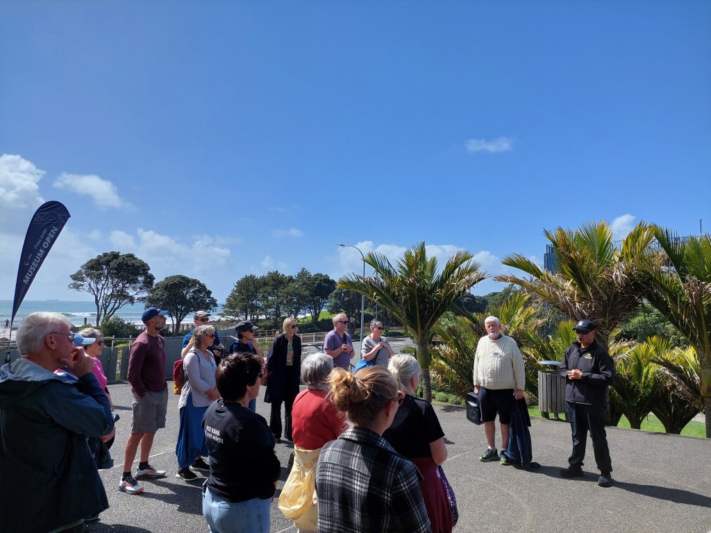 We were immensely privileged to have Damon Ritai, Tumu Whakarito – Te Kāhui o Taranaki, guide us on a walk up Brougham St and along the Huatoki Walkway. Damon painted a picture of central Ngāmotu as a rich pre-European Māori landscape, a place of settlement abundant in natural resources, comprising pā, papakāinga and māra, including Puke Ariki Pā, Mawhera, Waimanu/Pukupupuru Pā, and Pūkākā Pā, amongst many others.